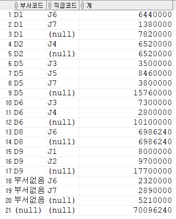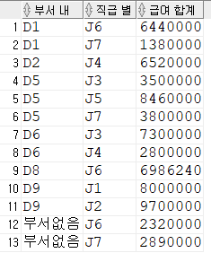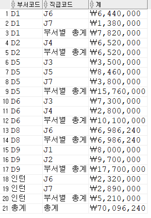 그룹별 합계는 출력 가능 (그룹화된컬럼, 그룹함수)