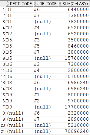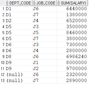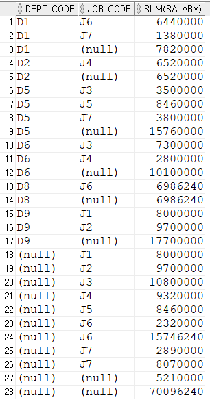 group by cube(dept_code, job_code)