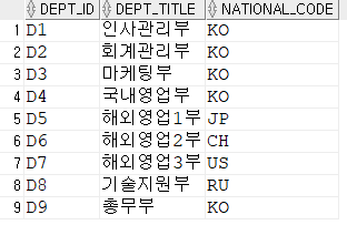 select dept_id, dept_title, national_code from DEPARTMENT, location