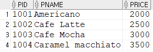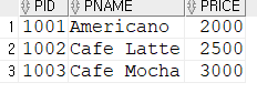 insert into cafe values(1003,'Cafe Mocha',3000);