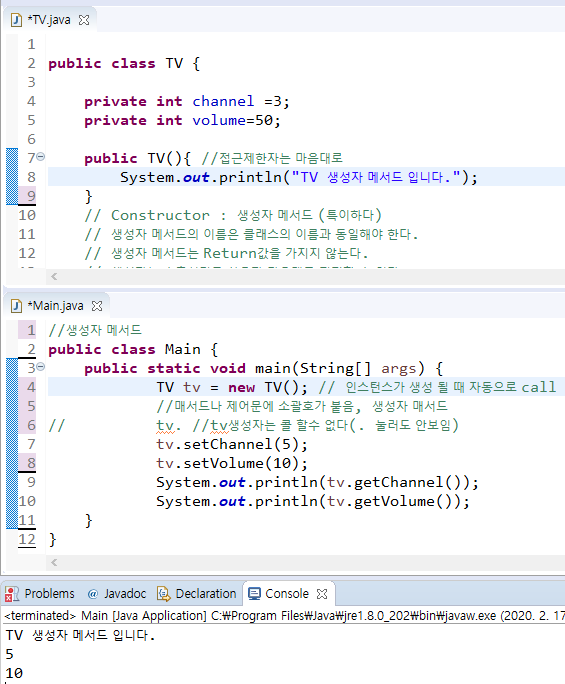 TV tv = new TV(5,10); // 인스턴스가 생성 될 때 자동으로 call