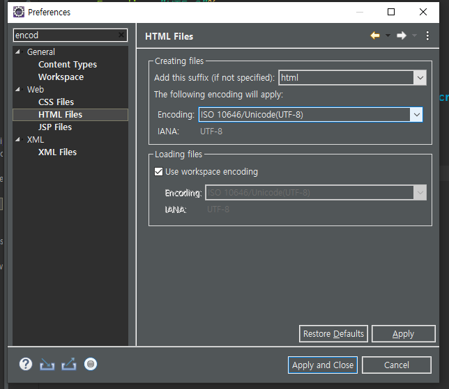 - CSS Files, HTML Files, JSP Files 모두에게 > Encoding에서 맨위에 UTF-8로 설정