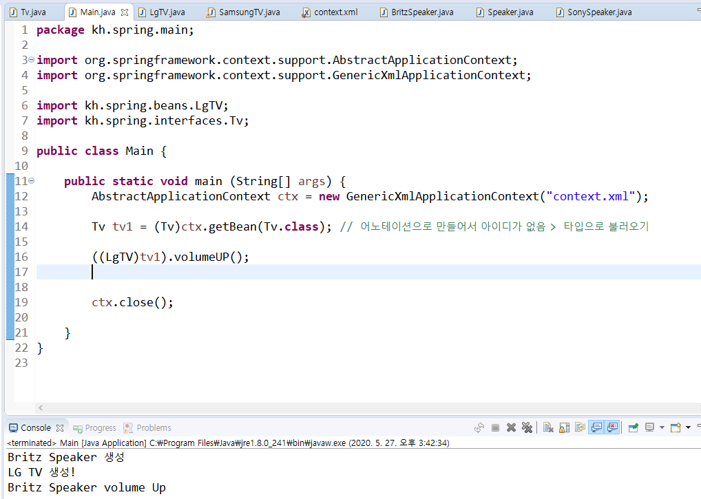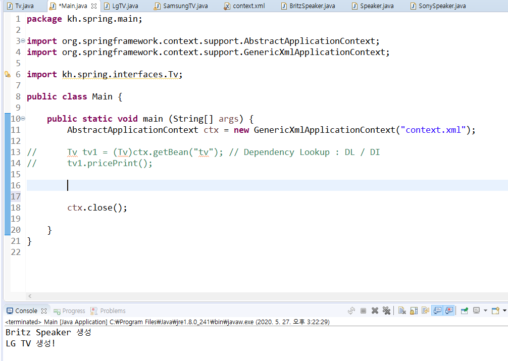 Tv tv1 = (Tv)ctx.getBean("tv"); // Dependency Lookup : DL / DI