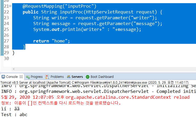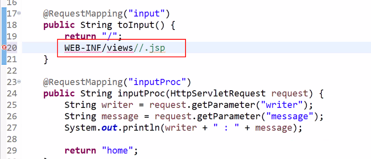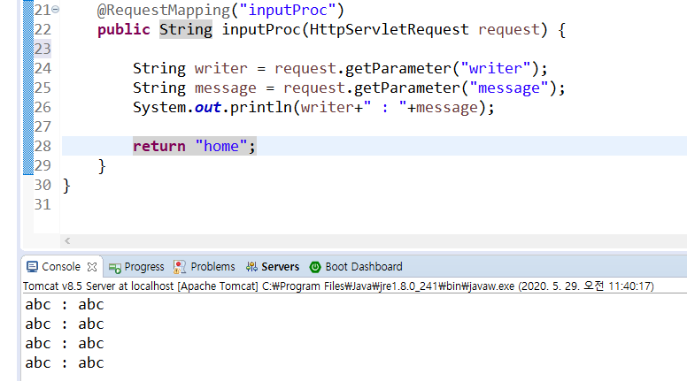 public String inputProc(HttpServletRequest requset,String writer, String message) {