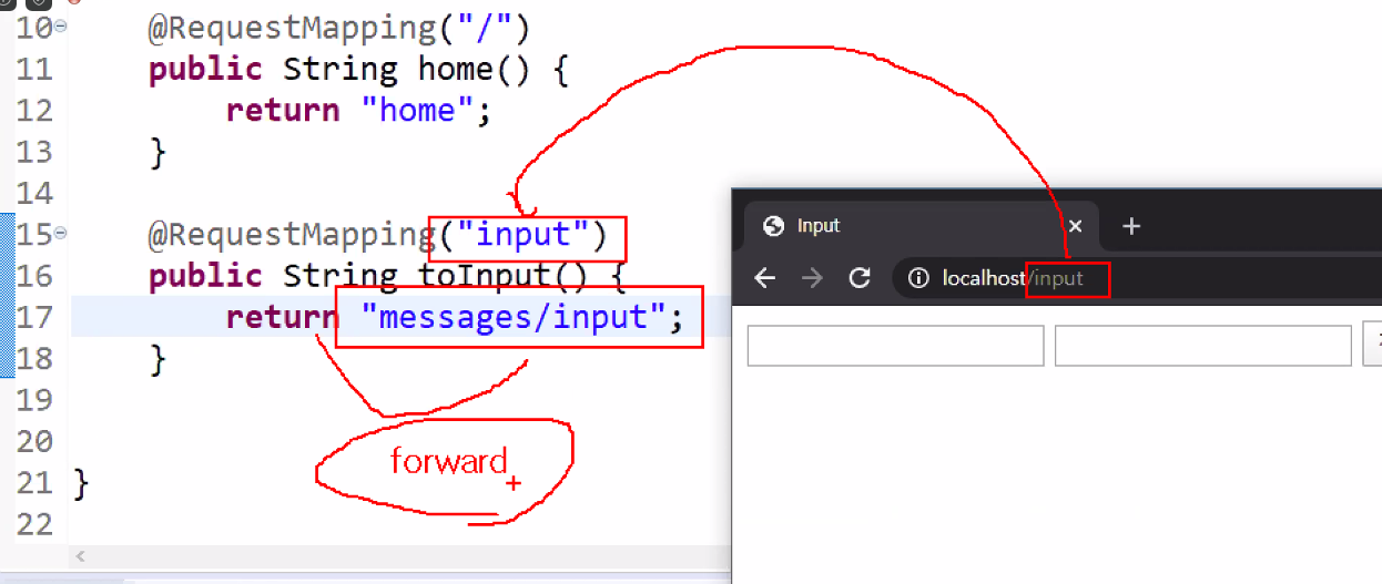 forward - 클라이언트에게 가라는 것이 아니라 서버가 내부적으로 페이지를 전환하는 것. 그래서 client가 보는 페이지 주소는 유지됨