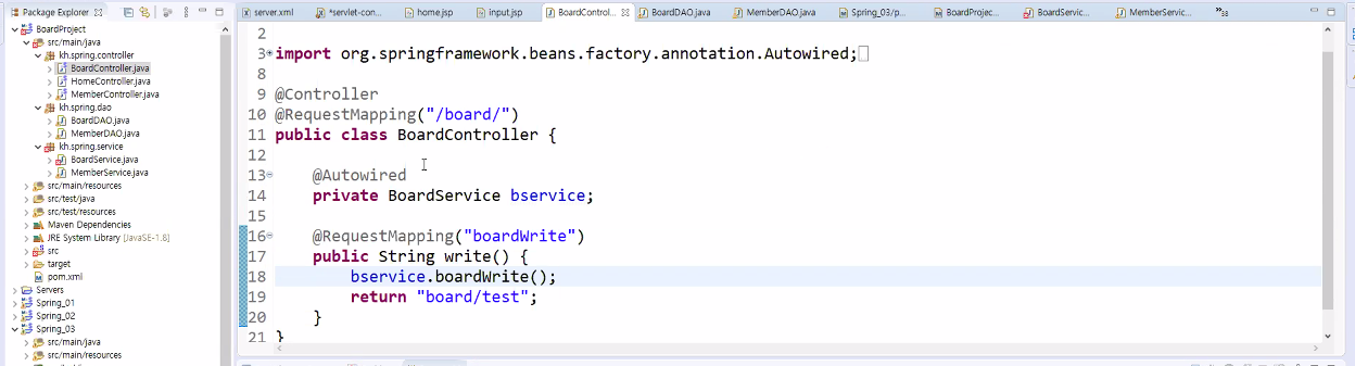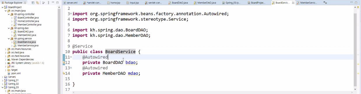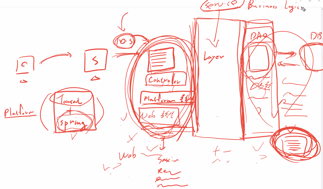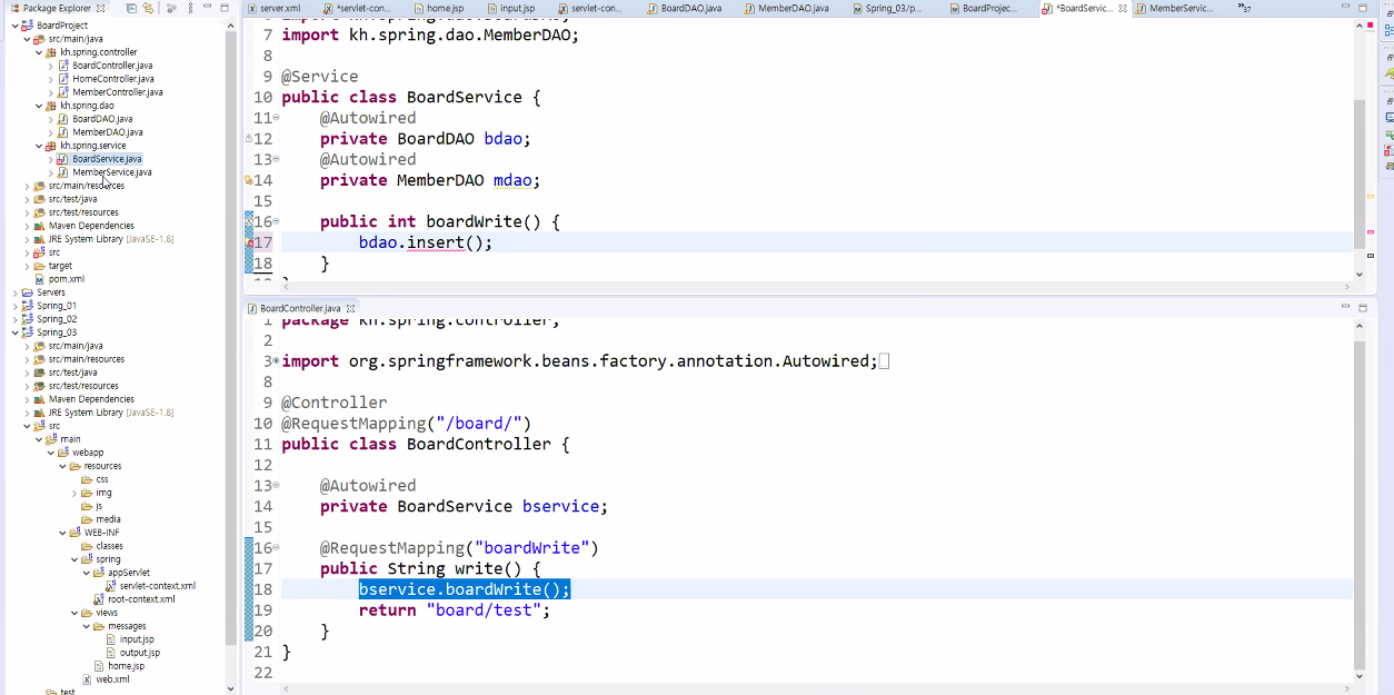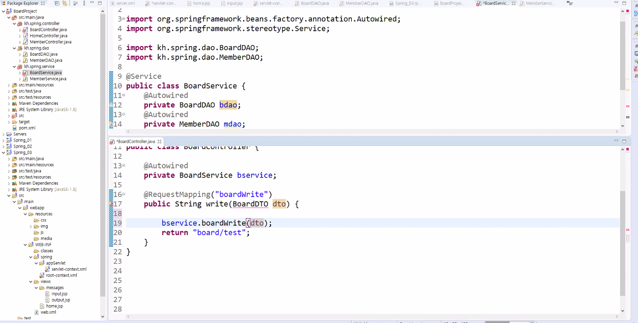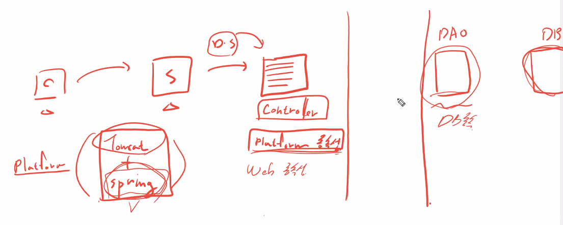 컨트롤러가 서비스레이어를 사용하고 서비스레이어가 DAO를 사용