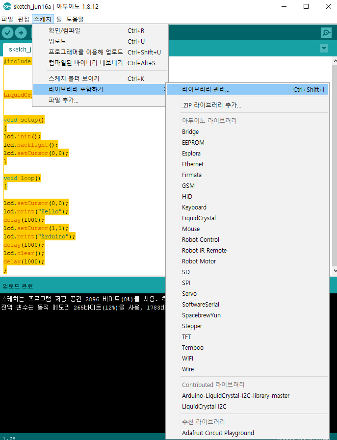 #include <LiquidCrystal_I2C.h> LiquidCrystal_I2C lcd(0x27,16,2); void setup() { lcd.init(); lcd.backlight(); lcd.setCursor(0,0); } void loop() { lcd.setCursor(0,0); lcd.print("Hello"); delay(1000); lcd.setCursor(1,1); lcd.print("Arduino"); delay(1000); lcd.clear(); delay(1000); }