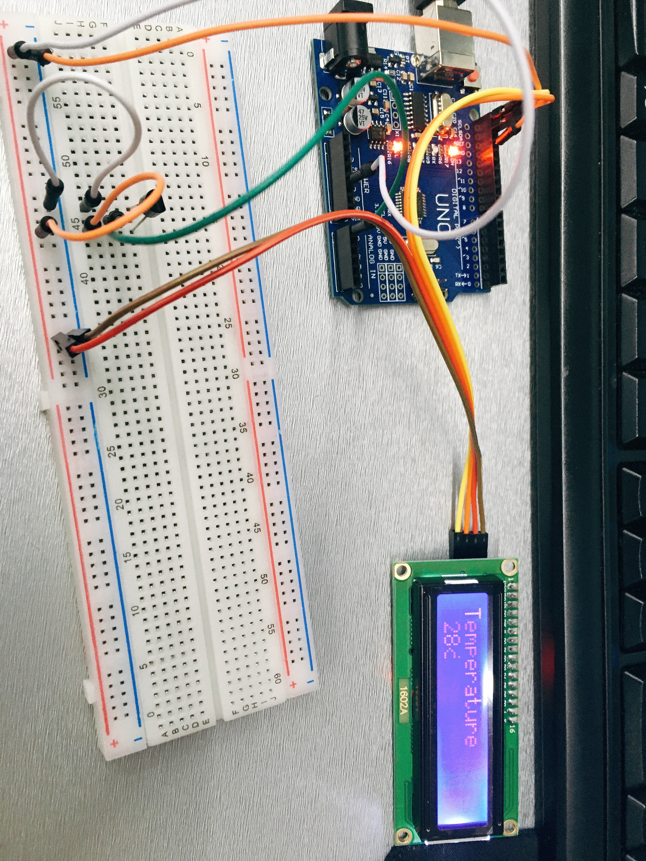 #include <LiquidCrystal_I2C.h> LiquidCrystal_I2C lcd(0x27,16,2); byte tp[8] = { B00001, B00000, B00111, B01000, B01000, B01000, B00111, B00000 }; void setup() { analogReference(INTERNAL); Serial.begin(9600); lcd.init(); lcd.backlight(); lcd.setCursor(0,0); lcd.createChar(0,tp); } void loop() { int input = analogRead(A0); int temp = input / 9.31; Serial.println(temp); delay(1000); lcd.setCursor(0,0); lcd.print("Temperature"); lcd.setCursor(1,1); lcd.print(temp); lcd.write(byte(0)); }