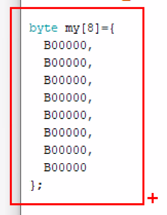 #include <LiquidCrystal_I2C.h> LiquidCrystal_I2C lcd(0x27,16,2); byte my[8] = { B00000, B00000, B11111, B01010, B11111, B00000, B00000, B00000 }; void setup() { lcd.init(); lcd.backlight(); lcd.setCursor(0,0); lcd.createChar(0,my); } void loop() { lcd.setCursor(0,0); lcd.write(byte(0)); }