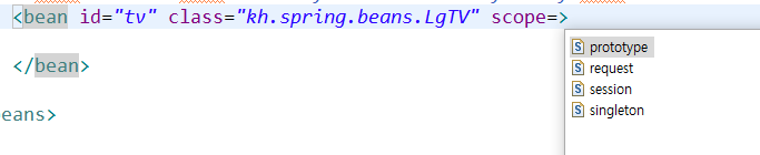 <bean id="tv" class="kh.spring.beans.LgTV" scope="prototype">