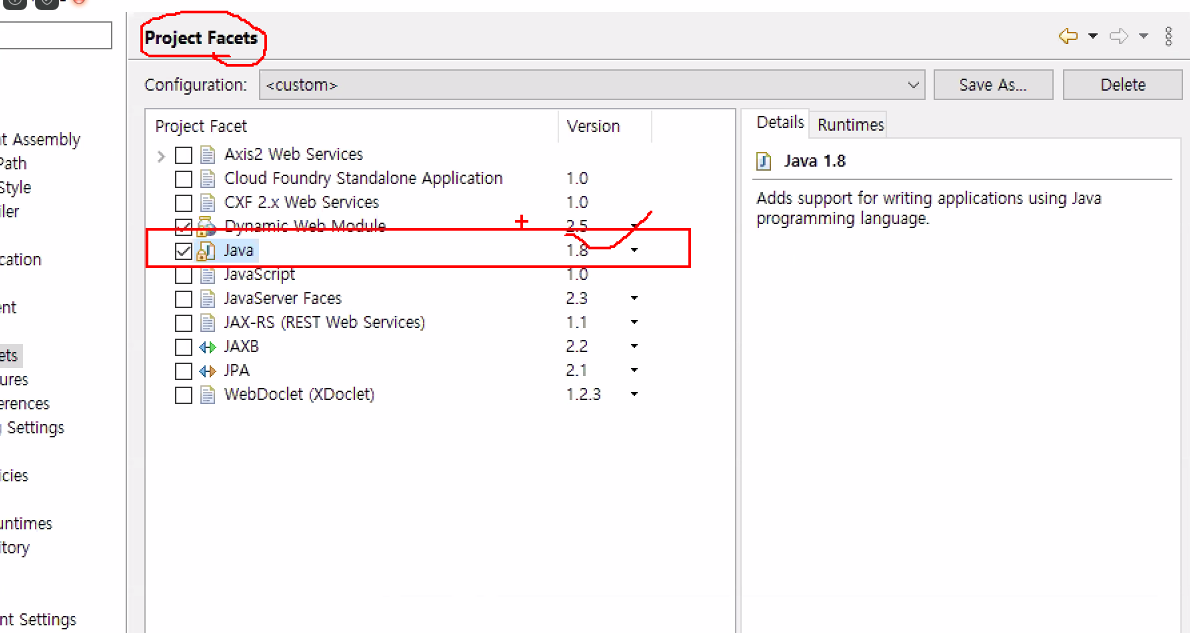 프로젝트 우클릭 > 프로퍼티 > Project Facets